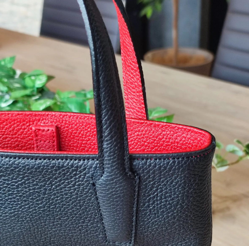 ブラック×レッドのコンビが上品なレザーバッグ。