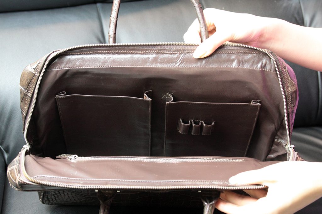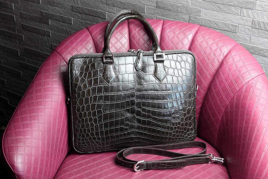 ブリーフケースはクロコダイル革のお腹部分を贅沢に2匹分使用しており、クロコダイル革の美しさを最大限表現したバッグとなっています。